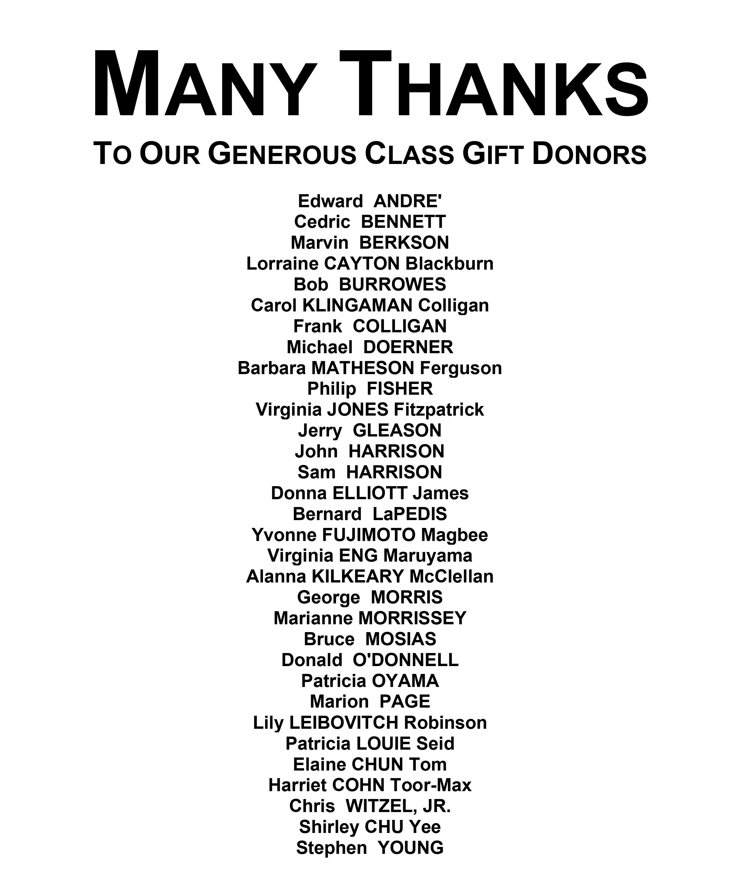 This event was initially planned for the fall of 2022 (which is 65 years from graduation). However, due to concerns about the continuing danger from Covid 19 (particularly for people in our age group), it was deferred into the late spring of 2023. Not wanting to lose sight of the aim of the celebration but to also note that the event was now, in essence, our 66th graduation year, the event was renamed the 65th + 1 Year Class Reunion.